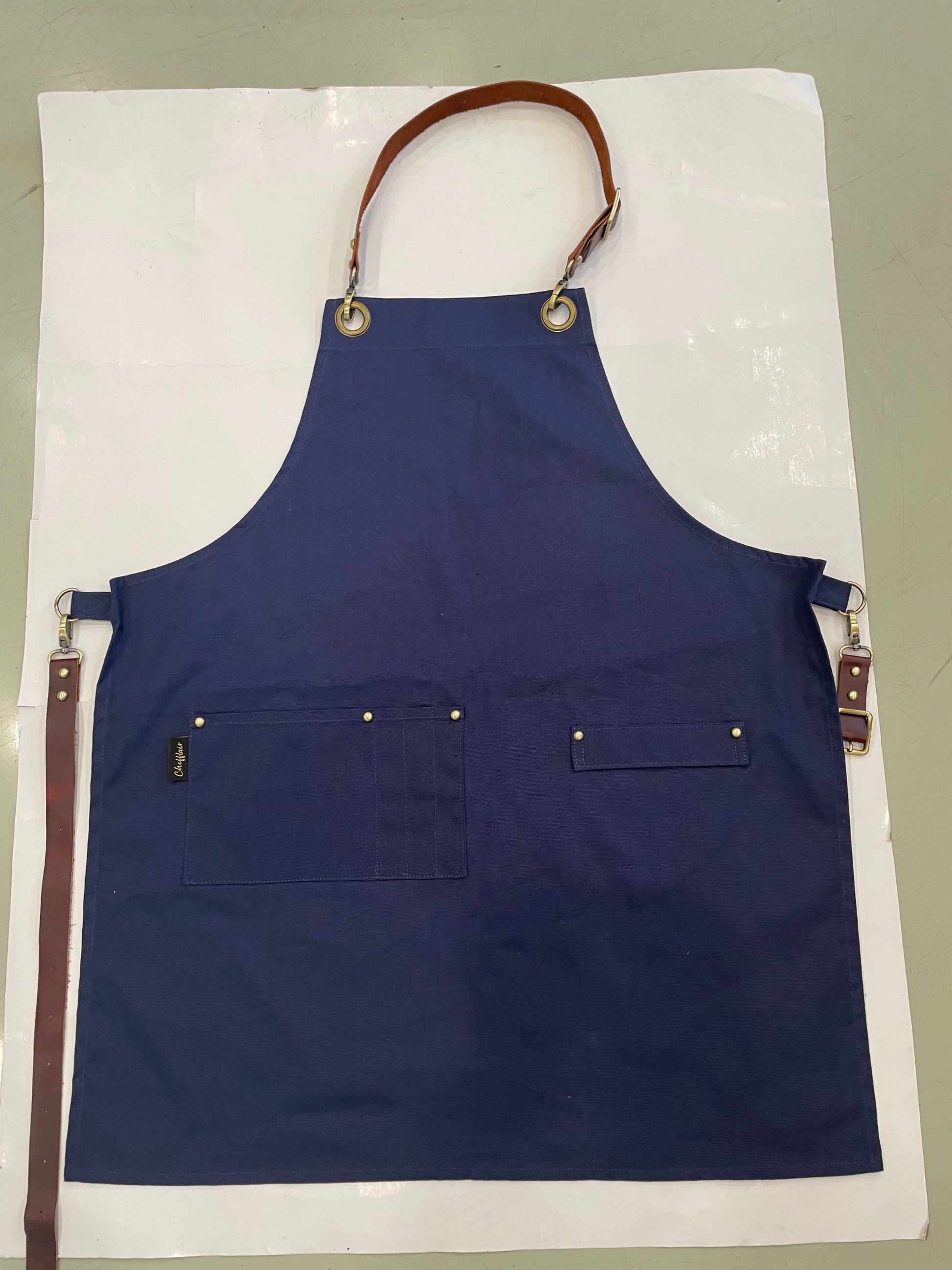 100% Heavyweight and Durable Cotton Canvas | Adjustable Dark Brown Genuine Neck Strap with Cotton Waist Ties and Brushed Brass Details | Apron Dimensions - 32” L x 27” W | Stitching matches fabric color for clean, seamless finish | Deep utility pockets, reinforced stitching, and durable construction | Towel Loop on Left Side | Available in 6 stylish colours - Black, Charcoal, Navy, Indigo, Olive, Camel